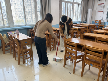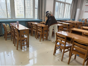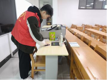 活动开始,学生代表们身着统一志愿者马甲,手持清洁工具,分为三组迅速投入工作。第一组负责擦拭教学楼走廊的宣传栏与门窗,第二组重点清理公共教室的桌椅缝隙积尘,第三组则深入包联的卫生区捡拾隐蔽垃圾。同学们以饱满的热情投入劳动,平时容易被忽视的暖气片夹层、讲台抽屉等细节处都进行了彻底清理。