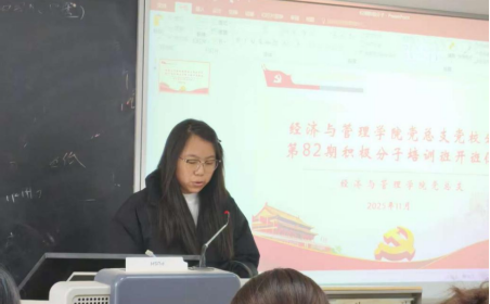 为加强入党积极分子的思想教育和理论武装,经济与管理学院于11月14日在富平校区教学楼1113教室举行第82期入党积极分子培训班开班仪式,学院党总支书记李富荣以及14名入党积极分子参加,团委书记王晶主持开班仪式。
