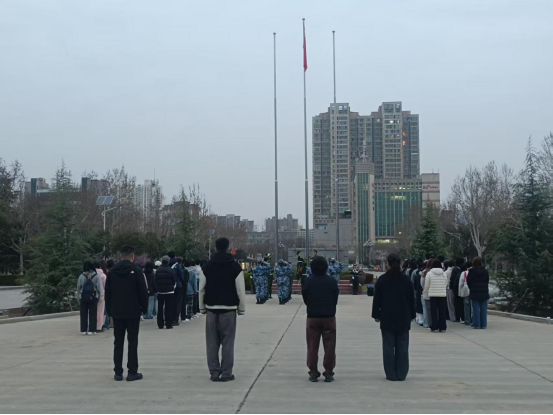 2026年3月23日,经济与管理学院在渭华门前举行庄严的升旗仪式,学院领导和朝阳校区全体学生参加。